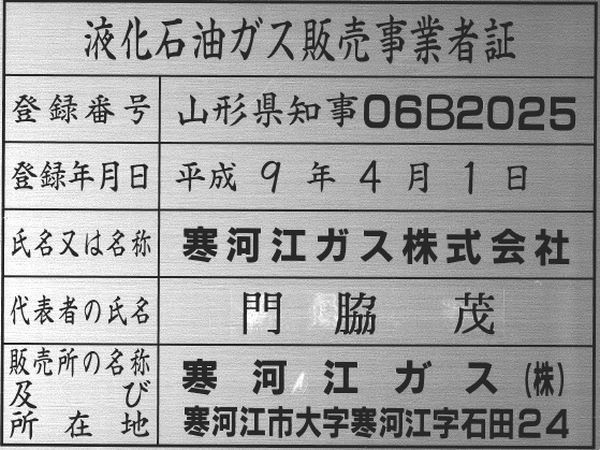 | 販売者の名称及び 所在地 | 寒河江ガス㈱ 寒河江市大字寒河江字石田24 |